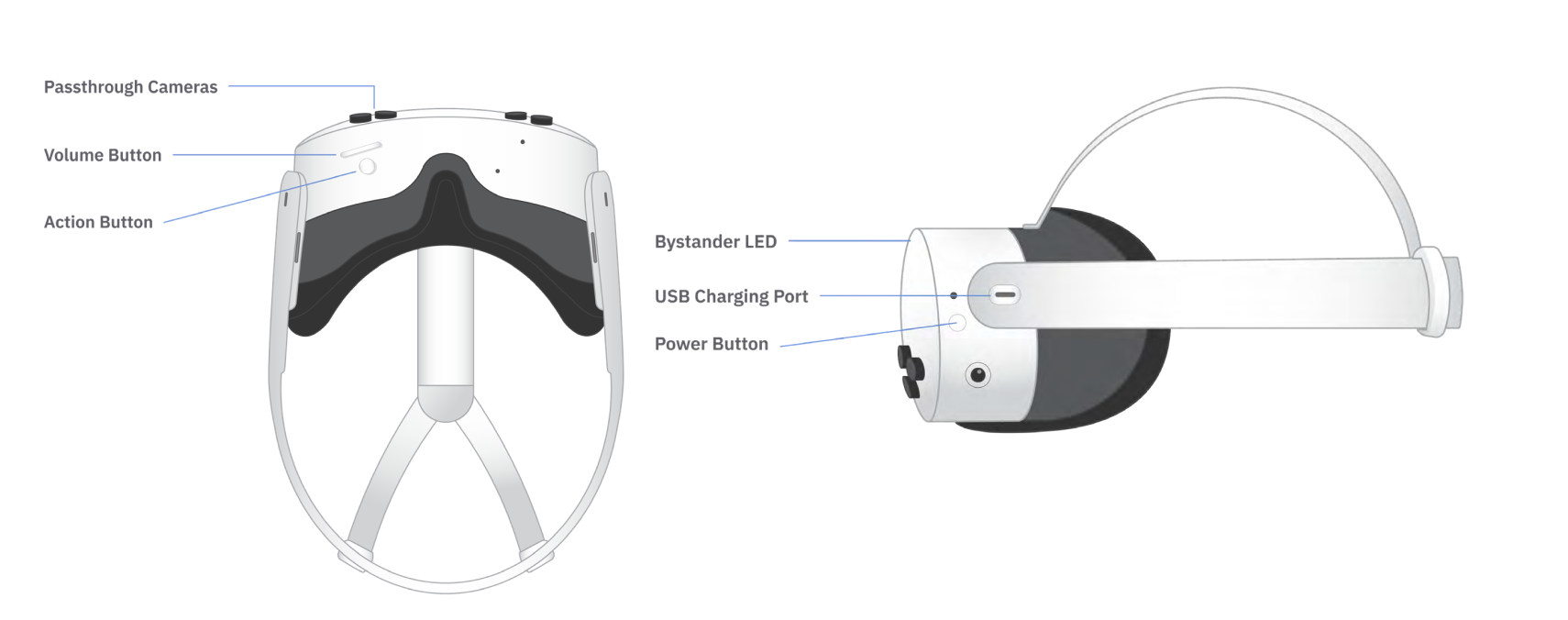 The Bystander LED is a small white light on the exterior of the headset; it indicates when the external cameras are active.